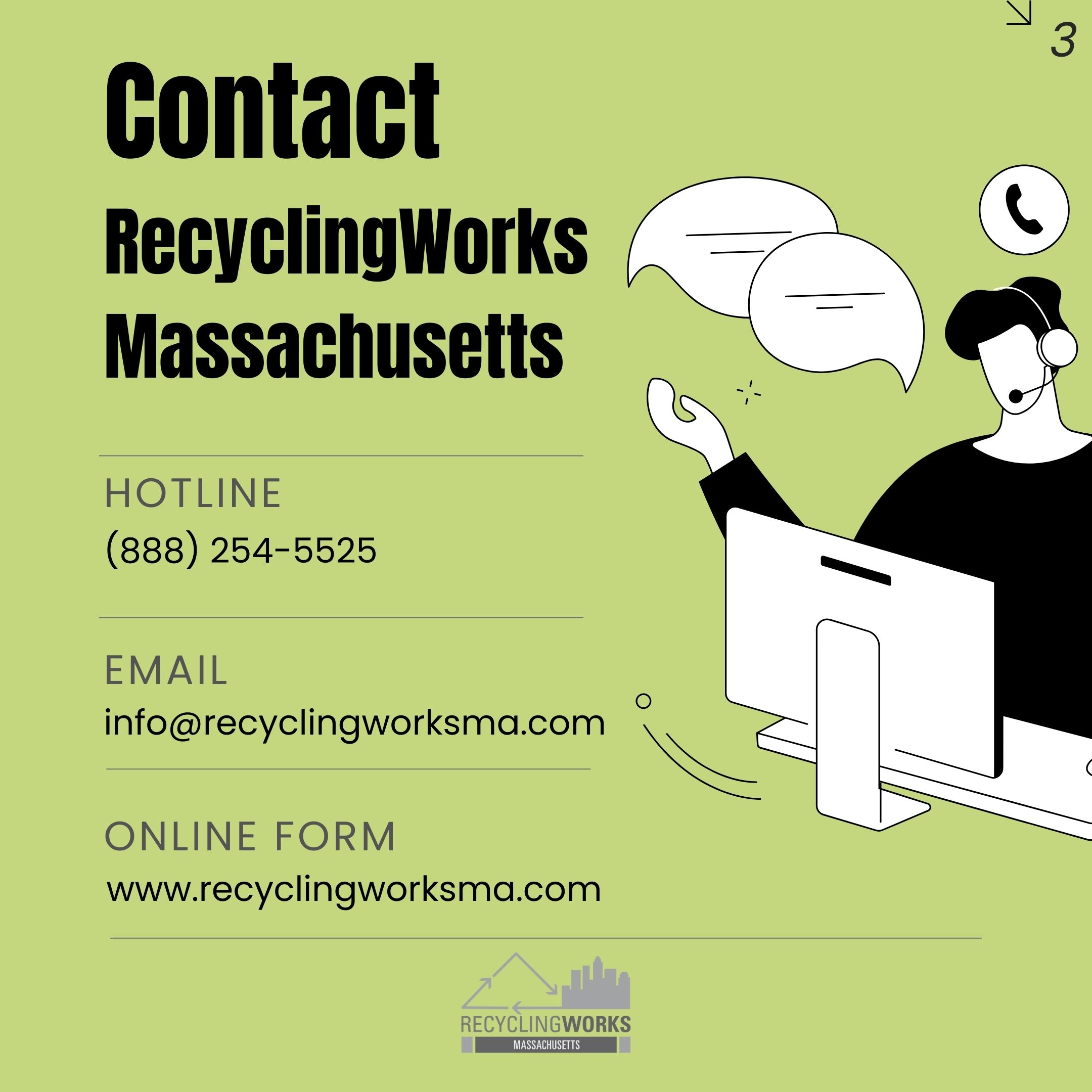 Get Started Today! Call the RecyclingWorks hotline at 888-254-5525, email info@recyclingworksma.com. or visit recyclingworksma.com to access a wealth of resources, from training videos to step-by-step guides.